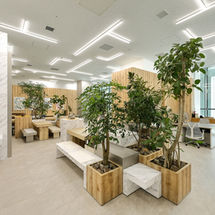 縦横に細やかに寸法調整した家具、樹種と枝振りで厳選した植栽とその配置により、ギャラリー/オフィス機能を散在させながら緩やかに区切りゾーニングしている。オフィスエリアに2席設ける集中作業ブースの中央間仕切壁は、先述条件で既存活用する天井スプリンクラーに向いた斜め壁とすることで散水障害を避けながら、エリアが一望でき開かれた席と、より集中を高める閉じた席と対比的なニーズに応える席を生み出した。